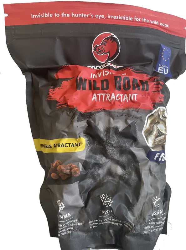 Blackfire Invisible fish er pellets med en helt utrolig aroma som tiltrækker vildsvin ind fra nær og fjern og ind på din foderplads. Disse pellets er virkelig noget vildsvinene nyder at gå og lede efter specielt hvis graver dem lidt ned eller lægger dem ud under væltede stammer eller i naturlige huller. Denne smag med fisk gøre sig også hvis du skal tillokke mår, ræv og ikke mindst Mårhund.