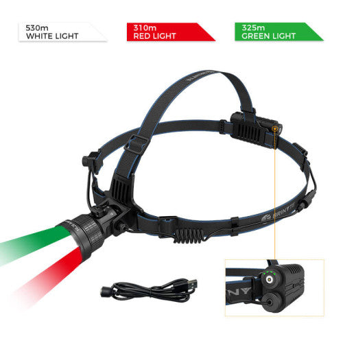 Brinyte HL28 3 farvet pandelampe, Rød , Grøn og Hvid.