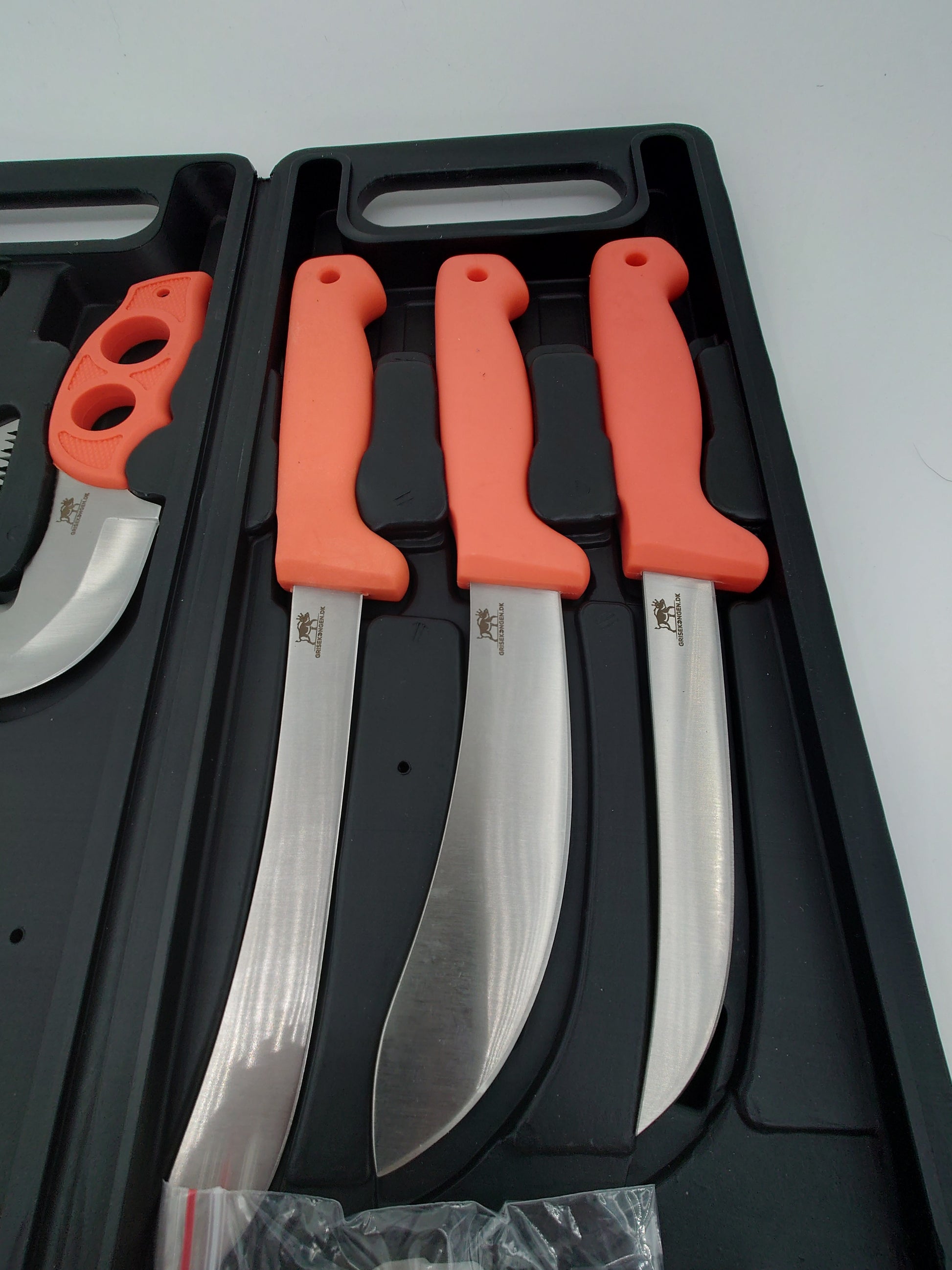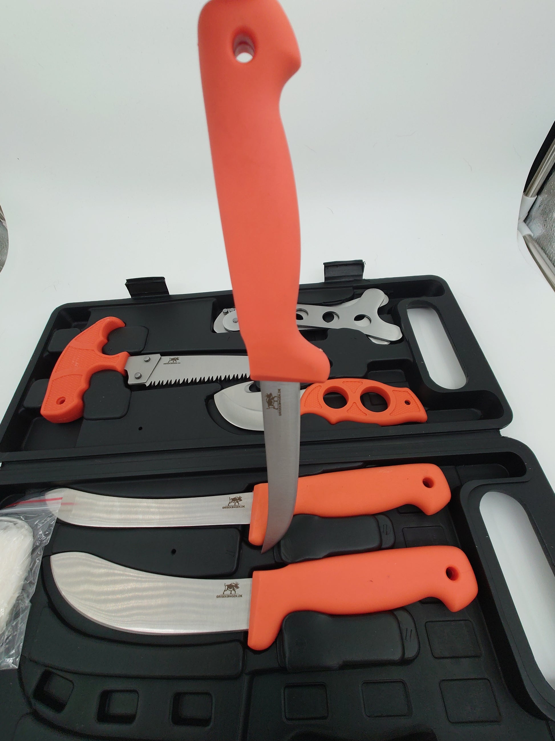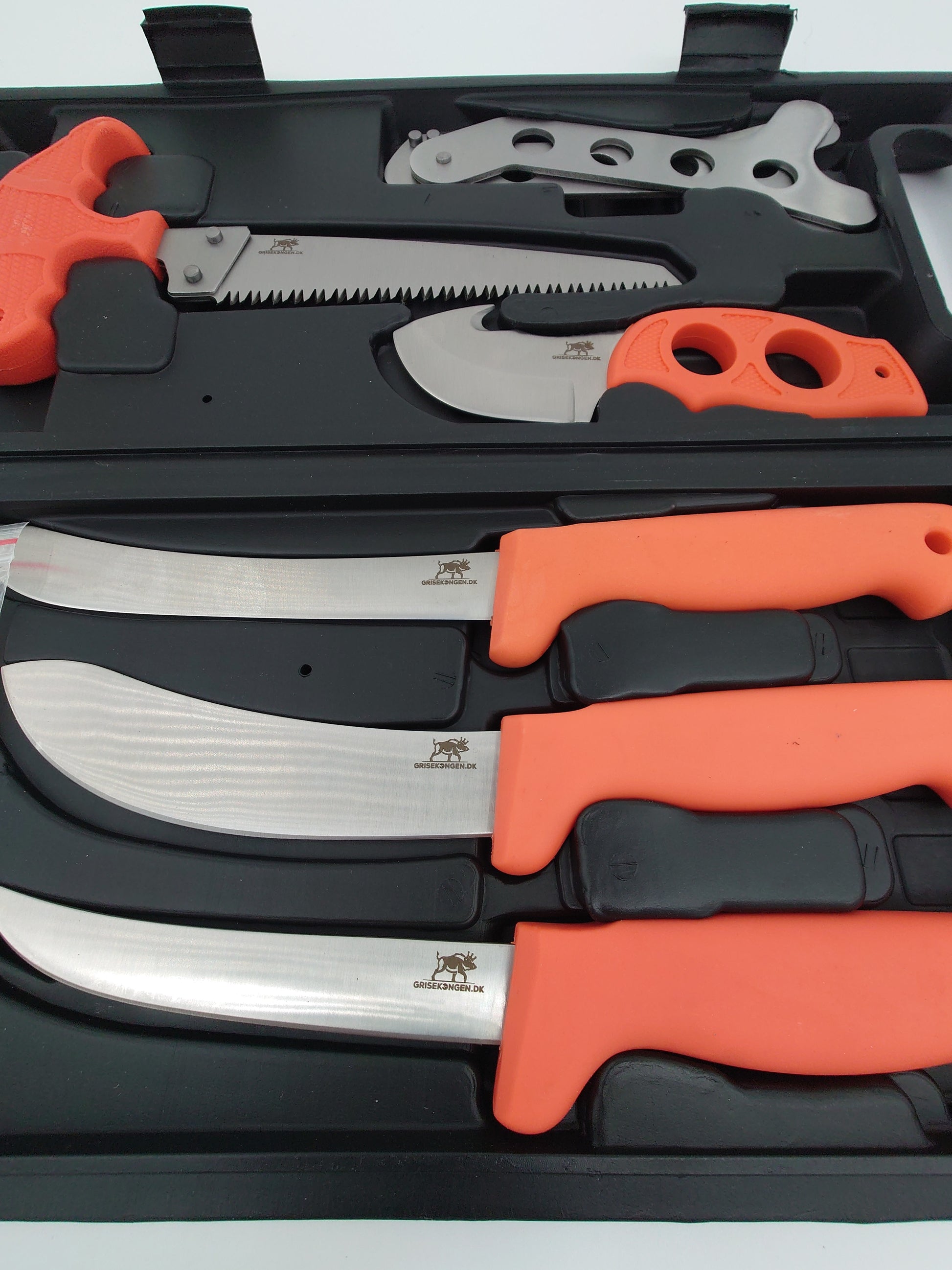 Fint slagtesæt med solide knive bug åbner ribben spreder sav handsker og knivsliber så du altid skarpe knive med dig. Orange håndtag så de ikke forelægges samt en fin hård plast box lige til at ha med på din favorit jagt
