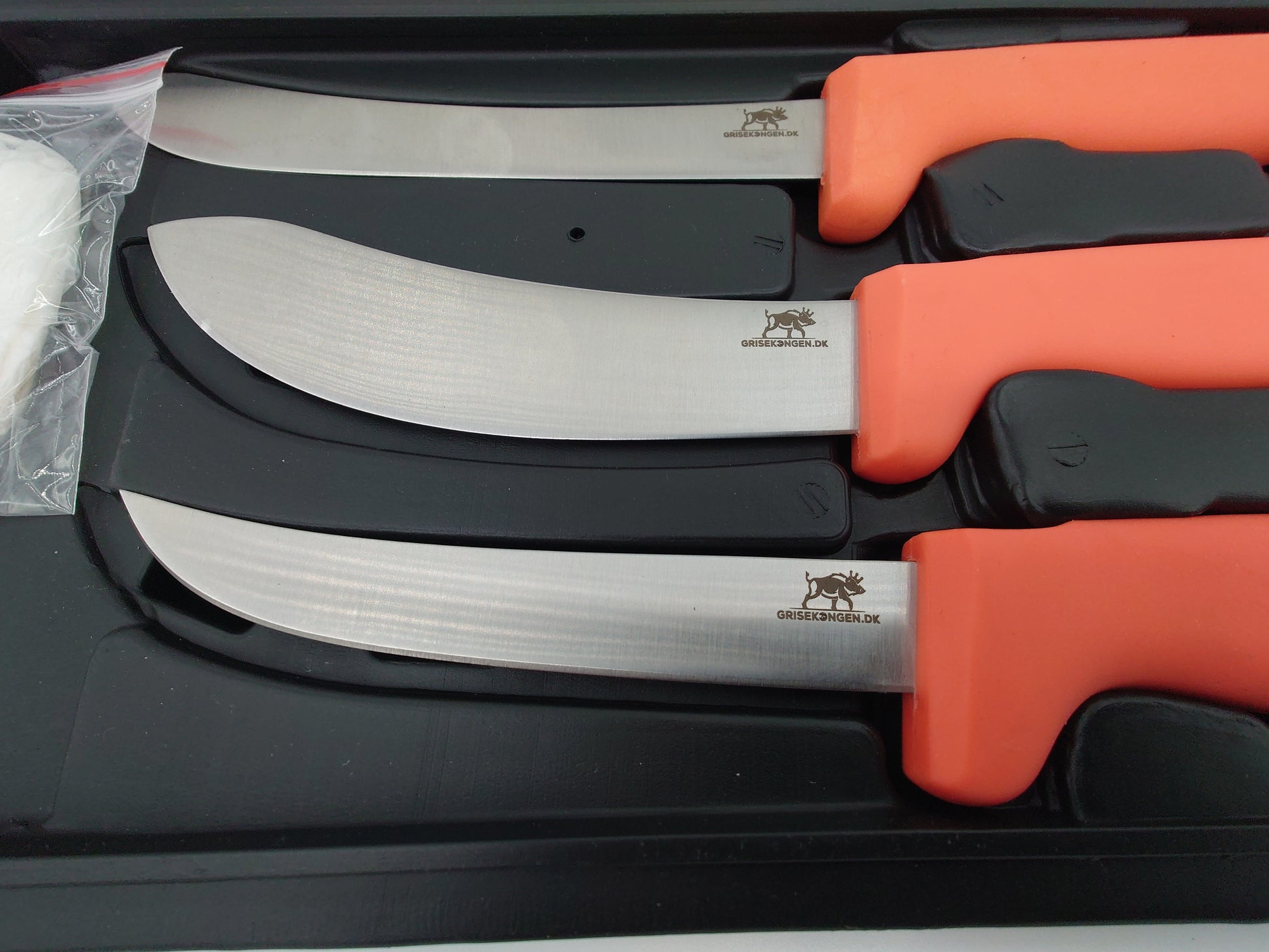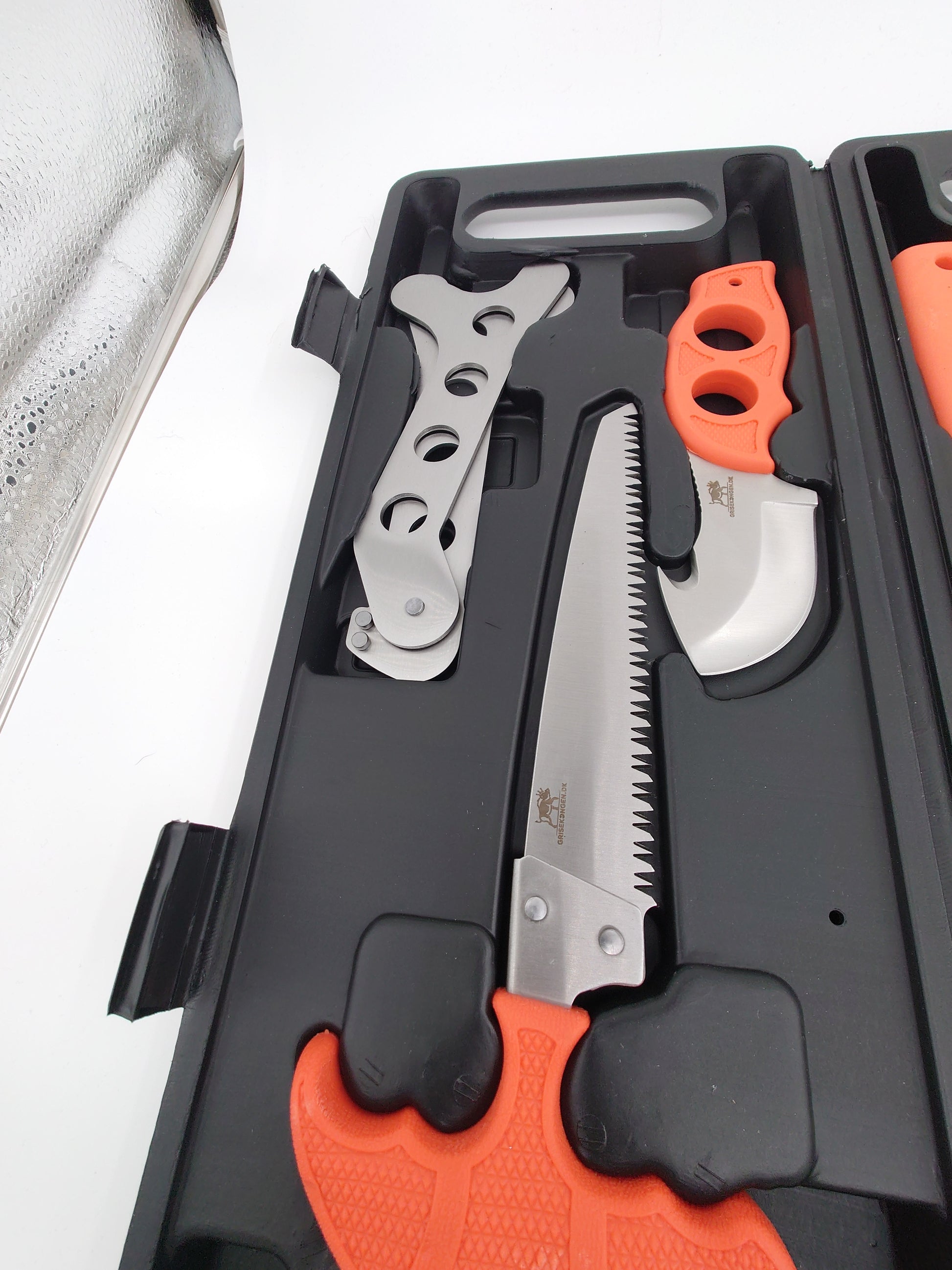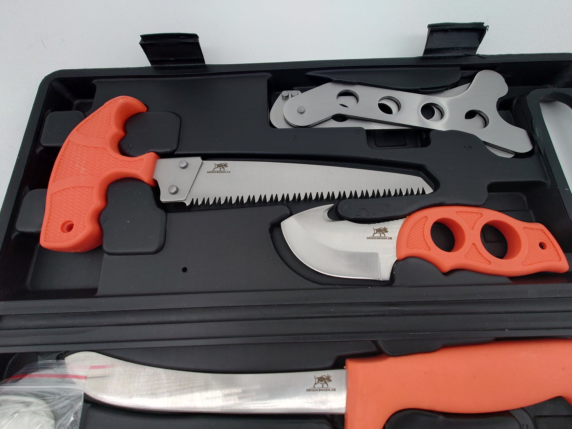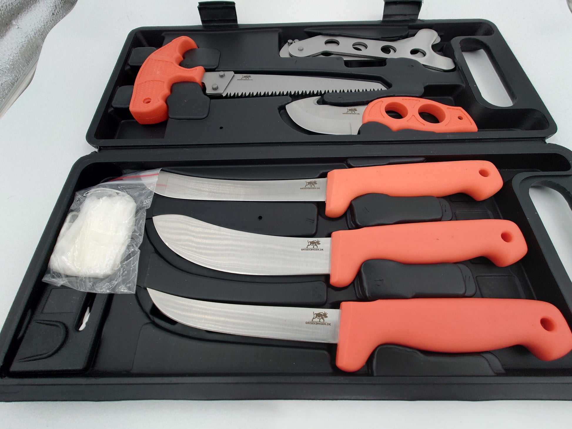Fint slagtesæt med solide knive bug åbner ribben spreder sav handsker og knivsliber så du altid skarpe knive med dig. Orange håndtag så de ikke forelægges samt en fin hård plast box lige til at ha med på din favorit jagt