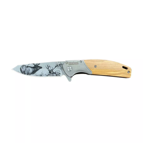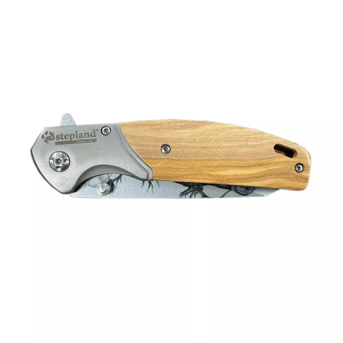 Stepland Foldekniven er en kniv med et flot træhåndtag og et 8 cm langt blad med et motiv af kronhjort. Det er en både praktisk og smuk foldekniv, som er nem at have med på farten. Du kan selvfølgelig have den liggende i lommen eller i tasken, men den kan også sættes fast i bukselommen med den medfølgende klips.