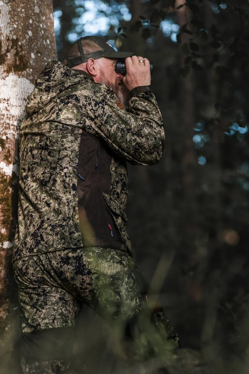 Jakken er fremstillet i børstet trikot af 100% genanvendt polyester, hvilket gør den blød, elastisk og lydsvag. Det reducerer støj fra bevægelse og gør jakken ideel til jagt, hvor du skal forblive lydløs.