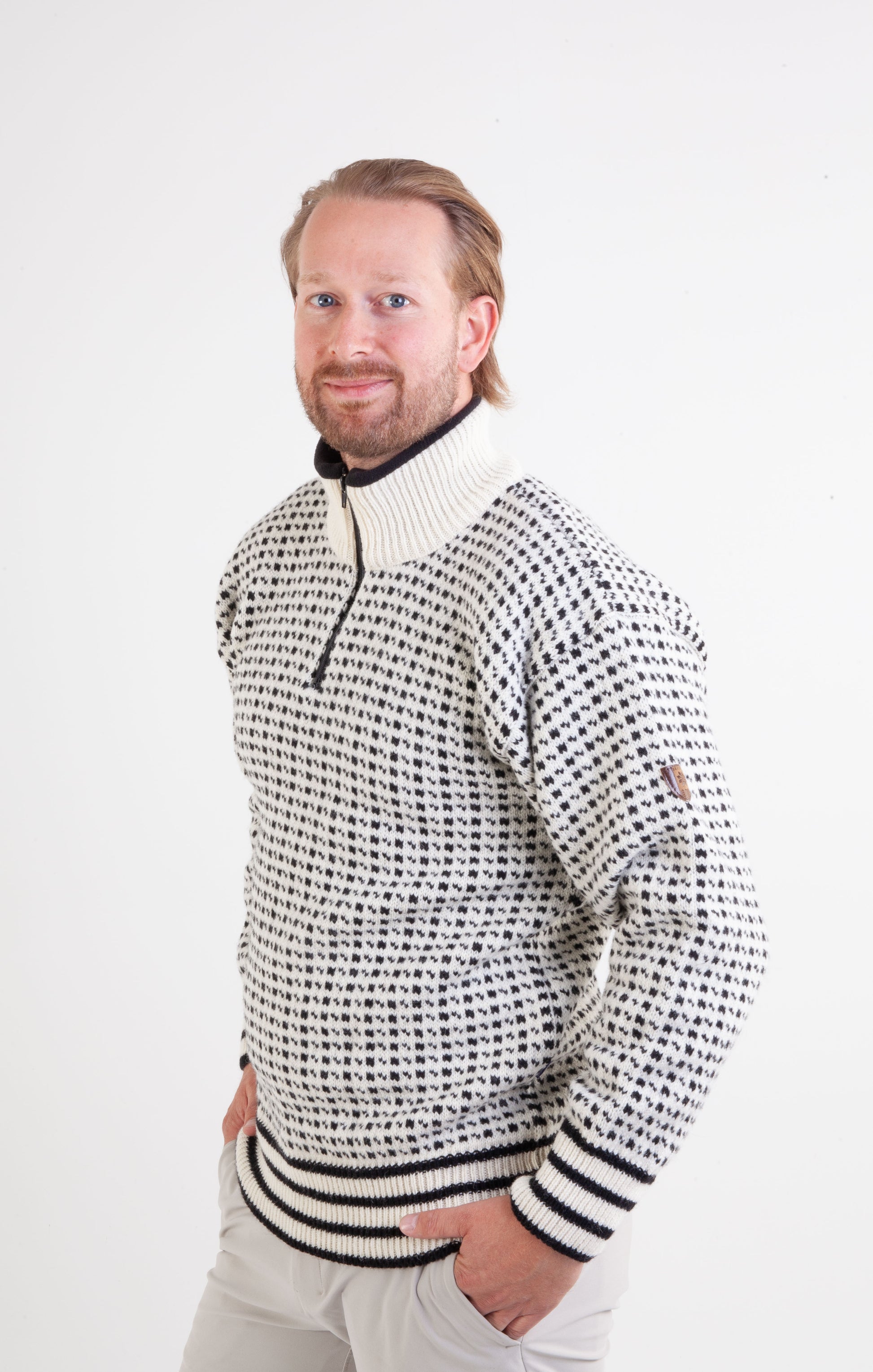 Islander er vores mest populære model og er produceret i 100% norsk uld høj hals med lynlås. Trøjen har fleecefor i nakken.