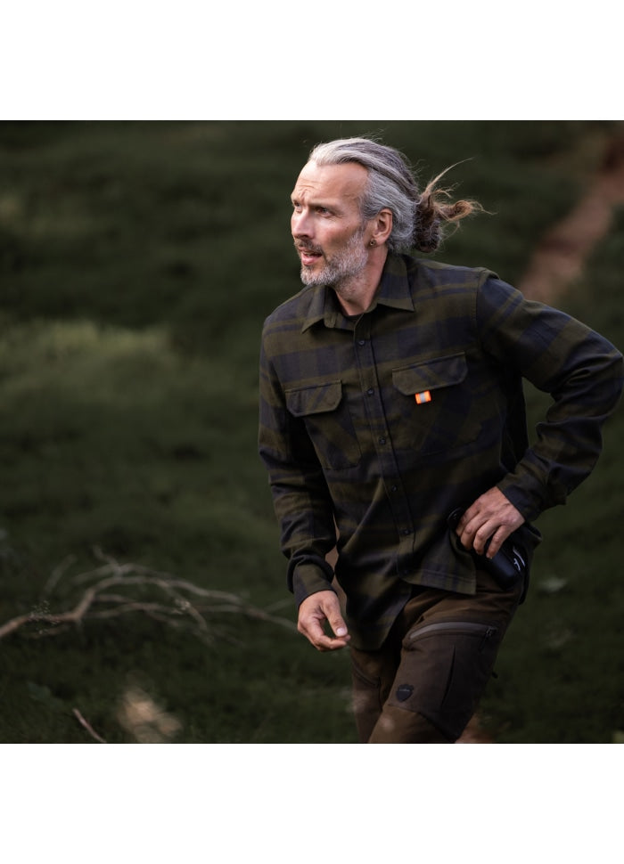 Kaare er lavet af børstet bomuld med stretch for ekstra komfort. Skjorten har to brystlommer med magnetlukning, og er konstrueret med dobbeltsyning i ærmerne for øget plads omkring arme og skuldre. Den er isolerende, og kan let benyttes som yderlag på varme dage.