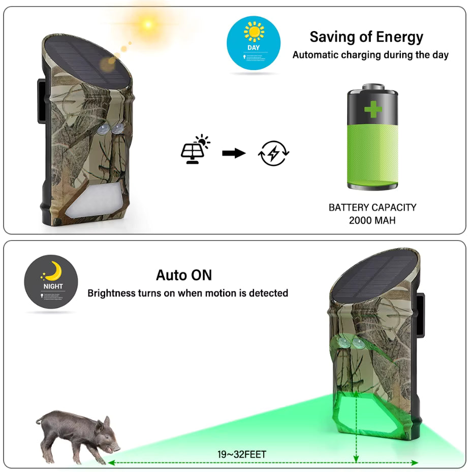 Da der ikke kræves ledningsføring, er dette solcelledrevne foderpladslys nemt at installere og flytte, hvilket gør det til en alsidig og praktisk tilføjelse til dit jagtudstyr.